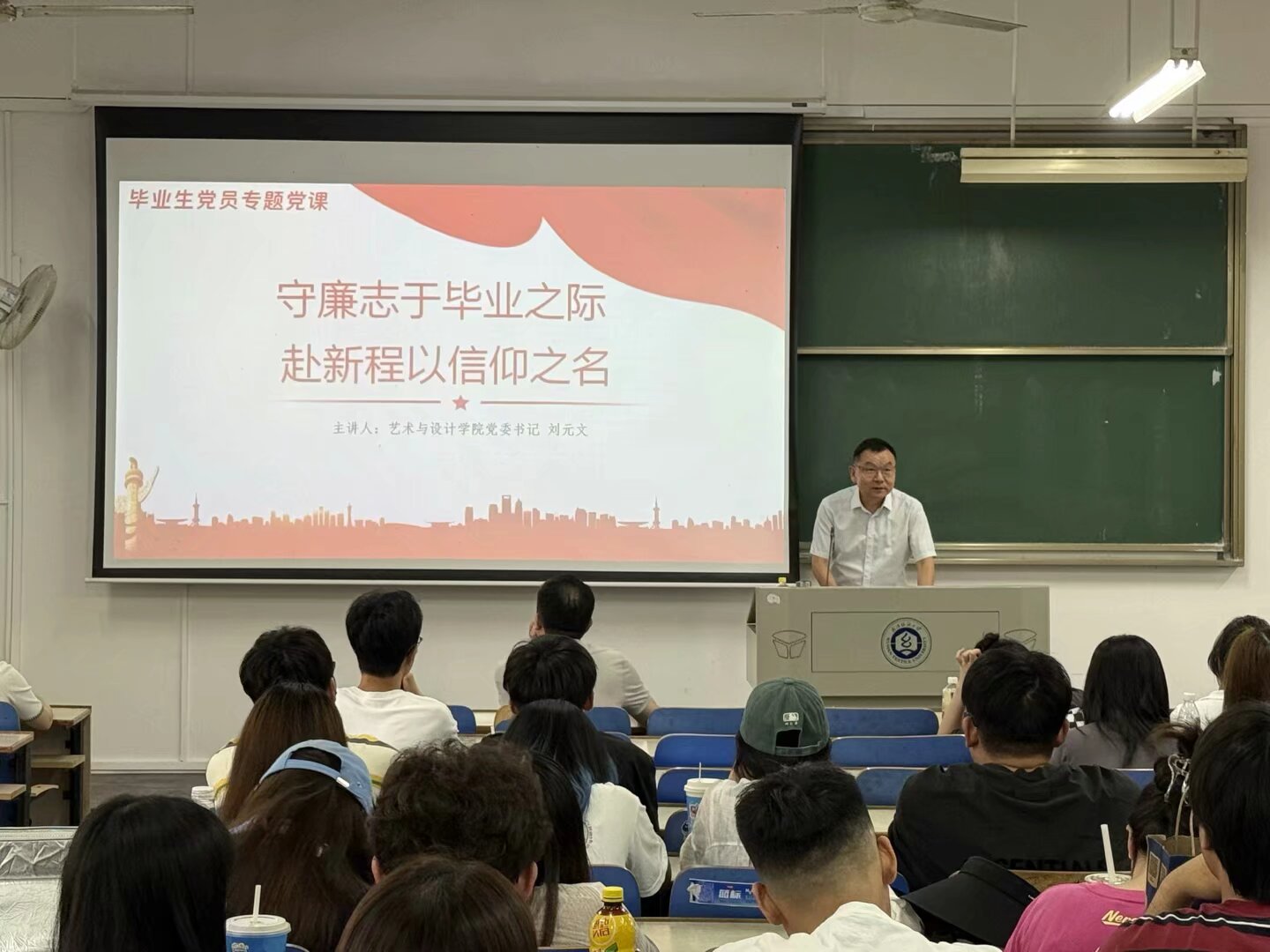 刘元文以“守廉志于毕业之际,赴新程以信仰之名”为主题,为毕业生党员讲授专题党课,他围绕不忘身份,时刻牢记党员纪律;深入贯彻中央八项规定精神学习教育要求;廉洁从业,扣好人生‘第一粒扣子’三个方面展开,通过观看警示教育片《深度调查·年轻有为莫妄为》,深刻阐释了党员遵纪守法的重要意义,结合深入贯彻中央八项规定精神学习教育,对大家提出了殷切希望。刘书记特别嘱咐毕业生党员要“系好职场第一粒扣子”,要始终不忘初心、牢记使命,在今后的工作生活中严格要求自己,筑牢思想防线,永葆党员本色。
