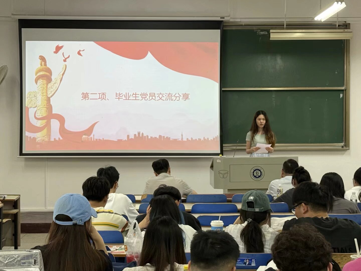 本科生党员代表朱亦婷、黄雨萱,研究生党员代表张嘉浚,伍凯旋,皮青分别作为各自支部代表上台作交流分享。几位党员代表分享了自己在党组织培养下的成长蜕变,表示将牢记母校与党组织的教诲,以党员标准严格要求自己,为党旗增光添彩。