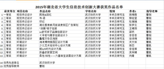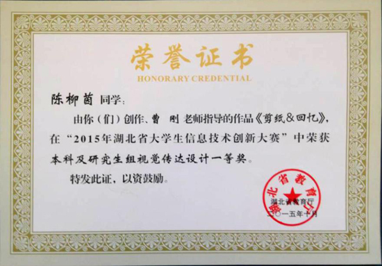 视觉传达设计系和环境艺术设计系两个专业选送的学生作品在本次大赛中获得了1个一等奖,4个二等奖,8个三等奖的好成绩。我校艺术学院视传专业研三学生陈柳茵凭着参赛作品《剪纸回忆》荣获视传组一等奖,同时将代表湖北省参加11月20日至22日在太原理工大学举行的全国总决赛。我校曹刚老师荣获优秀指导教师奖,我校被评为优秀先进单位。