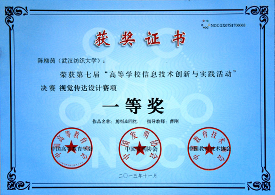 自6月接到学校通知,我校艺术学院认真组织相关专业备战本次比赛。最终艺术学院视传专业研究生陈柳茵凭着作品《剪纸&回忆》通过了湖北省决赛答辩并推荐参加全国总决赛,经过专家评审、陈述答辩等环节的激烈角逐,陈柳茵不负众望荣获视觉传达设计比赛项目全国一等奖,曹刚老师荣获第七届高等学校信息技术创新与实践活动优秀指导教师奖。