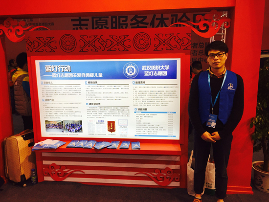 本届赛会项目涵盖阳光助残、关爱农民工子女、文化宣传和网络文明、环境保护与节水护水、禁毒教育和法律援助、邻里守望与为老服务、扶贫开发与应急救援等九大领域,蓝灯志愿团作为阳光助残类项目参赛,创始人李震同学作为答辩手向评委阐述了项目,团中央、中国志愿者协会领导还莅临湖北代表团,亲切鼓励志愿者们发扬大爱精神,再接再厉。最终,我校蓝灯志愿团关爱自闭症儿童“蓝灯行动”获得银奖,获奖成绩居全省高校前列。
