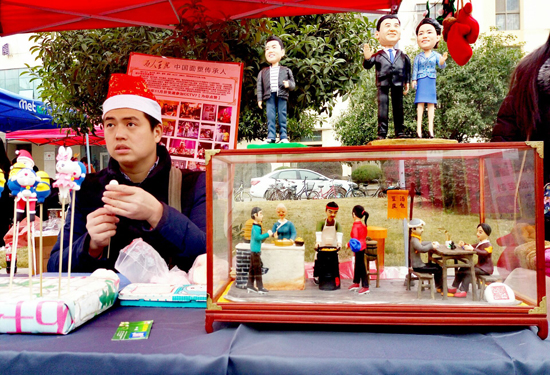 刚走进校园,就看见现场人头攒动、气氛热烈。来自校内外32位民间艺人在各自的摊位上忙的不亦乐乎,面人、剪纸、软陶、手工书签、铝线工艺品、手工皮具和编绳等等,真可谓是玲琅满目。其中面人艺人王虎最是吸引大家的眼球,他曾上过央视,是不折不扣的的红人,在他摊位的桌子上摆着习大大、彭麻麻和朱军等公众人物的面人,一个个活灵活现、栩栩如生。王虎18岁来武汉做厨师,22岁开始改做面人行当。问及面人制作工具,他介绍到,除了两把剪刀,其他工具都是自制的。面人也称面塑,是一种民间工艺品。面人已入选国家非物质文化遗产名录。面人以面粉、糯米粉为主要原料,再加上颜色、石蜡、蜂蜜等成分, 制作而成。彩色的面团,在他手中揉捏几下就变得生动了起来。