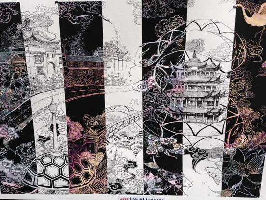 2015级小鲜肉们都积极参与到活动中来,他们的艺术作品内容丰富,形式多样,有写实的,有记录的,有创新的,还有临摹的,来自大类11508班的陈朗同学的作品吸引了广大师生的眼球,这副画构思独特,打破了传统绘画整体彩色或黑白的风格,而是采用彩色黑白分别间隔的方式达到一种特殊的效果,不仅整体给人感觉耳目一新,而且在黑底的背景下采用彩色线条勾勒使整个画面丰富活泼起来。经询问得知,原来陈朗从小就非常热爱绘画,从中学开始跟随专业老师学习画画,到了高中的时候接触到了素描,从此就一发不可收拾,从喜欢到迷恋,从迷恋到痴狂……