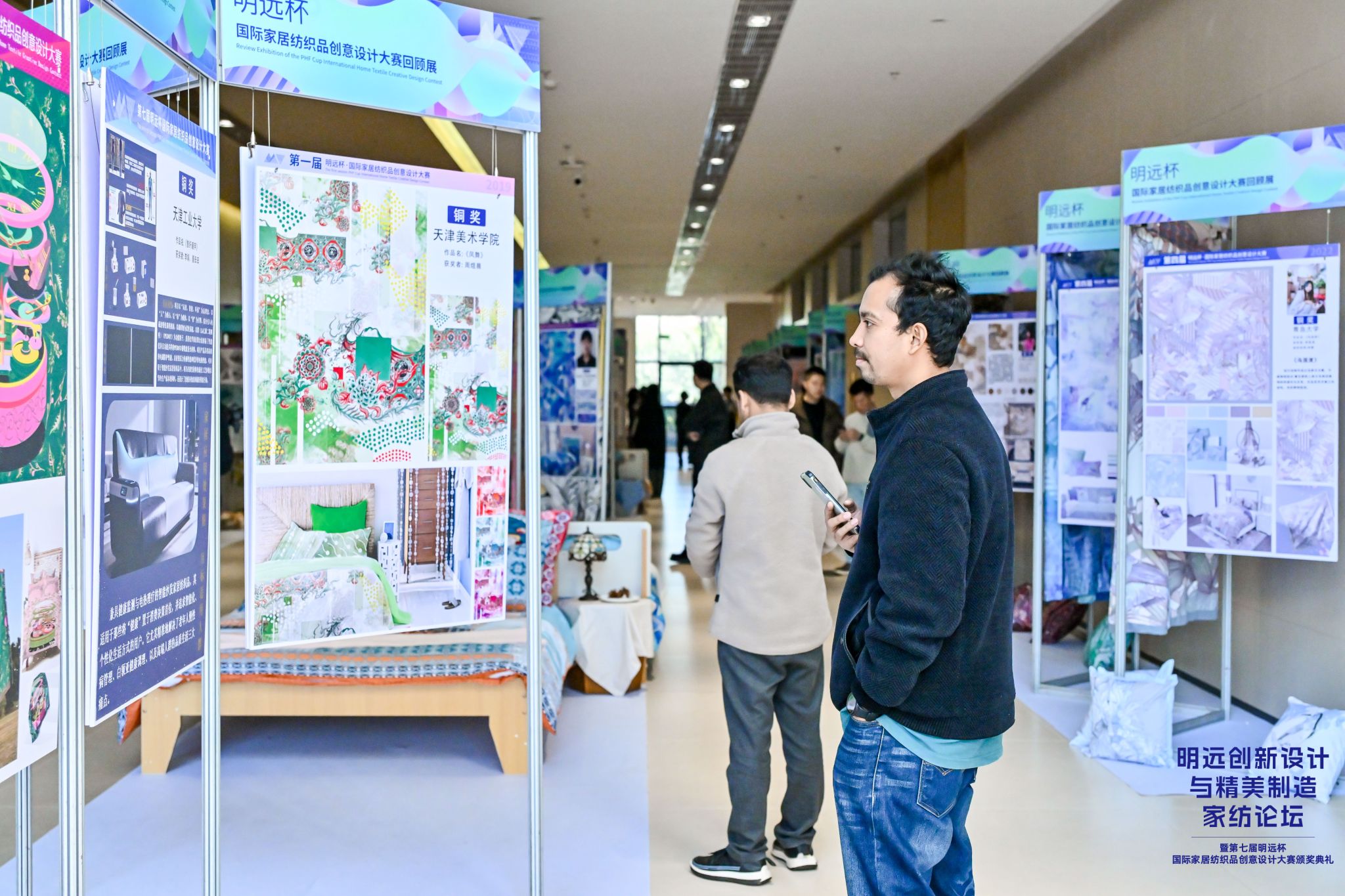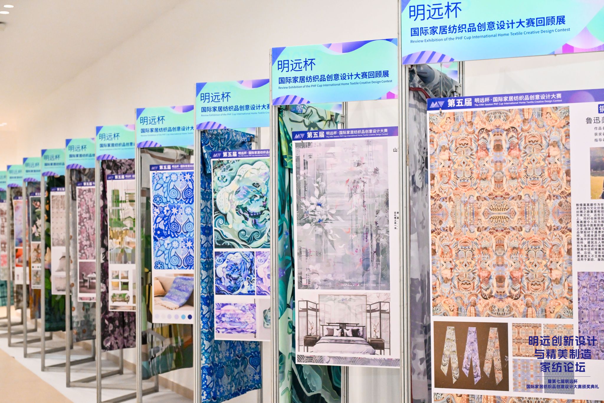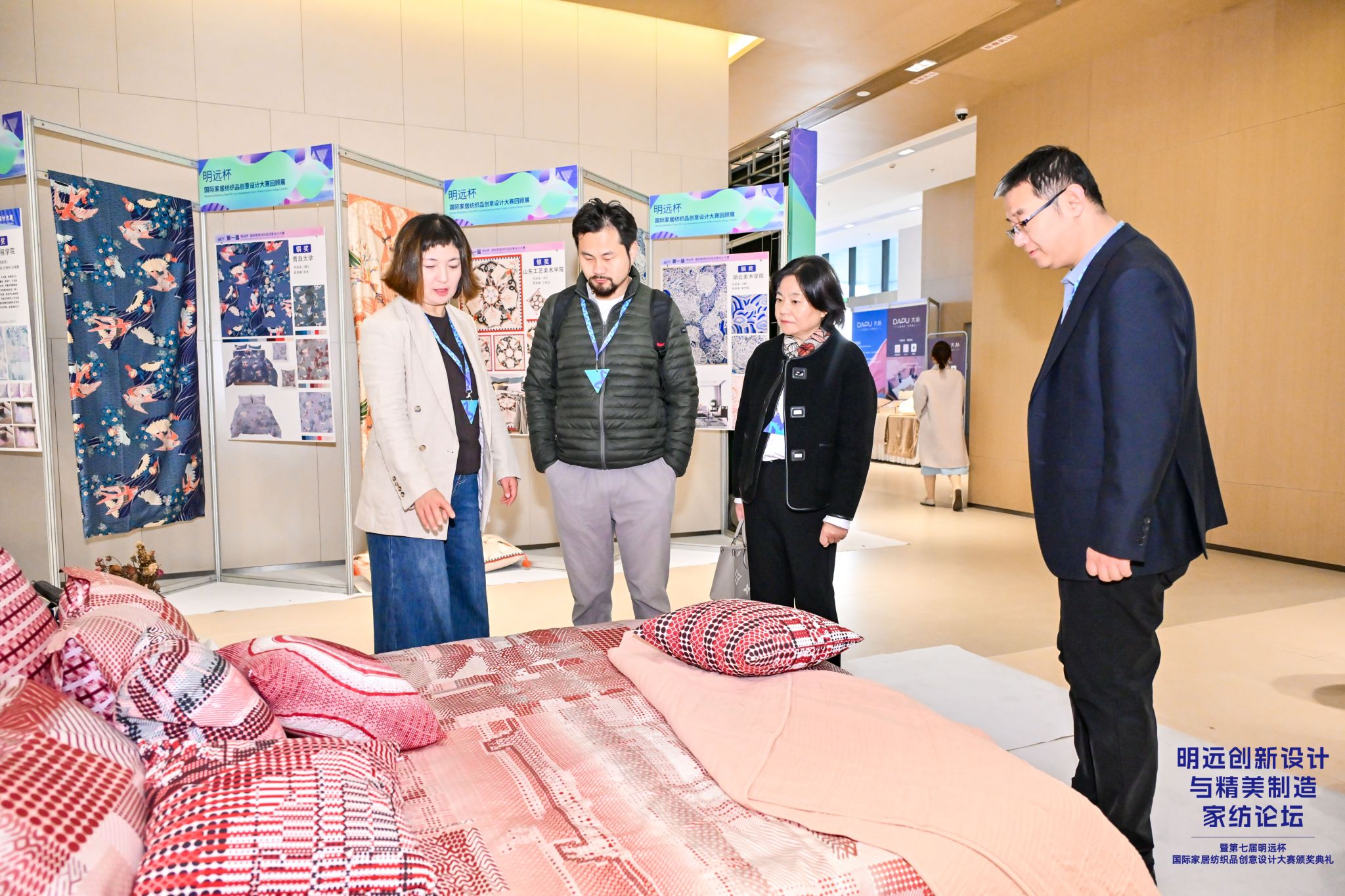 本次展览精心梳理了历届“明远杯”大赛优秀作品,全方位呈现设计的演变轨迹,这些作品从东方韵味的细腻刺绣到西方简约的几何构图,从环保材料的创新应用到智能纺织的先锋探索,无数青年才俊以敏锐洞察力和大胆想象力,将“设计赋能生活”的理念化为现实,让家居纺织品从实用品升华到情感表达的媒介。