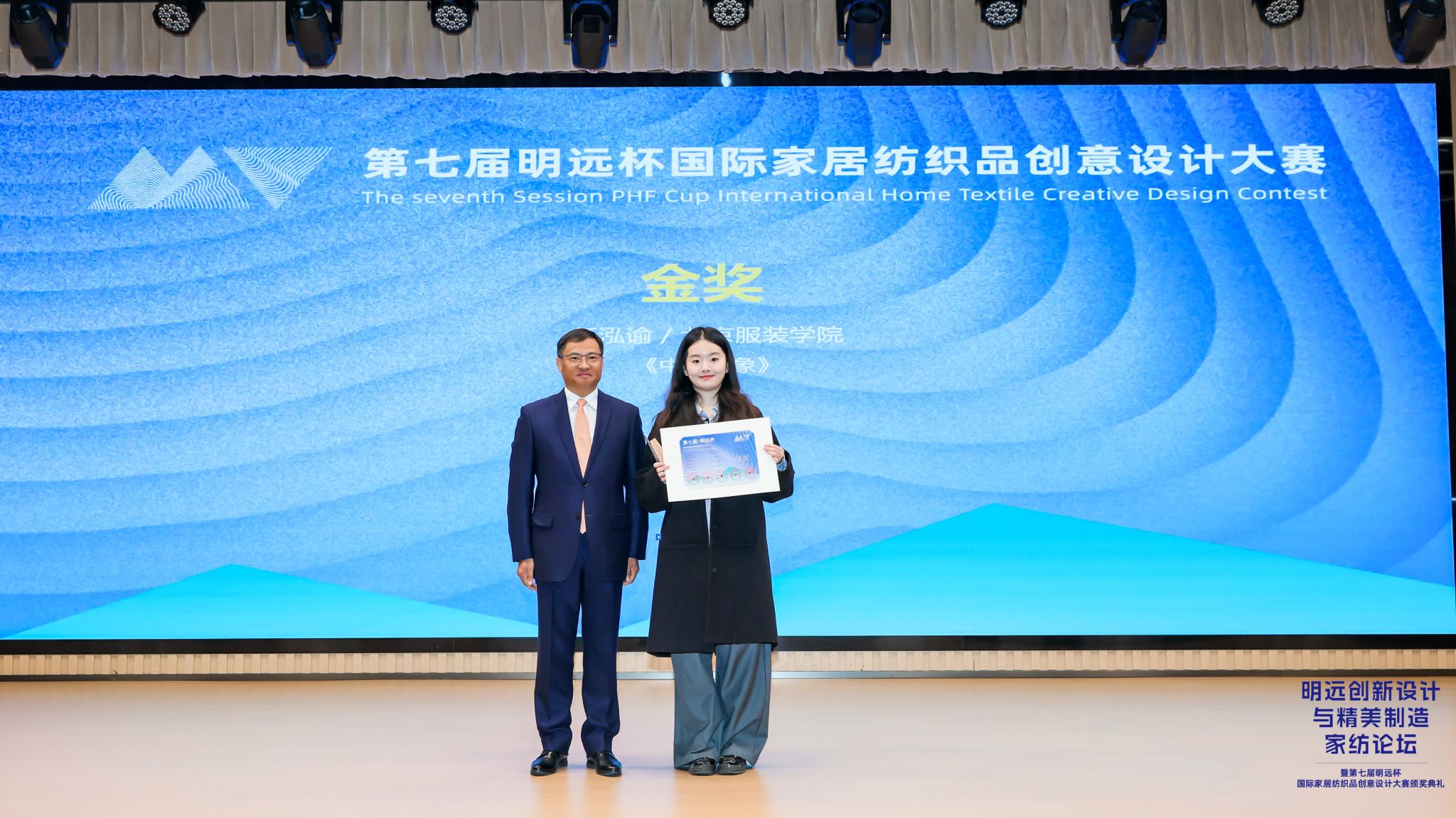 中国纺织品进出口商会会长曹甲昌为金奖选手颁奖。