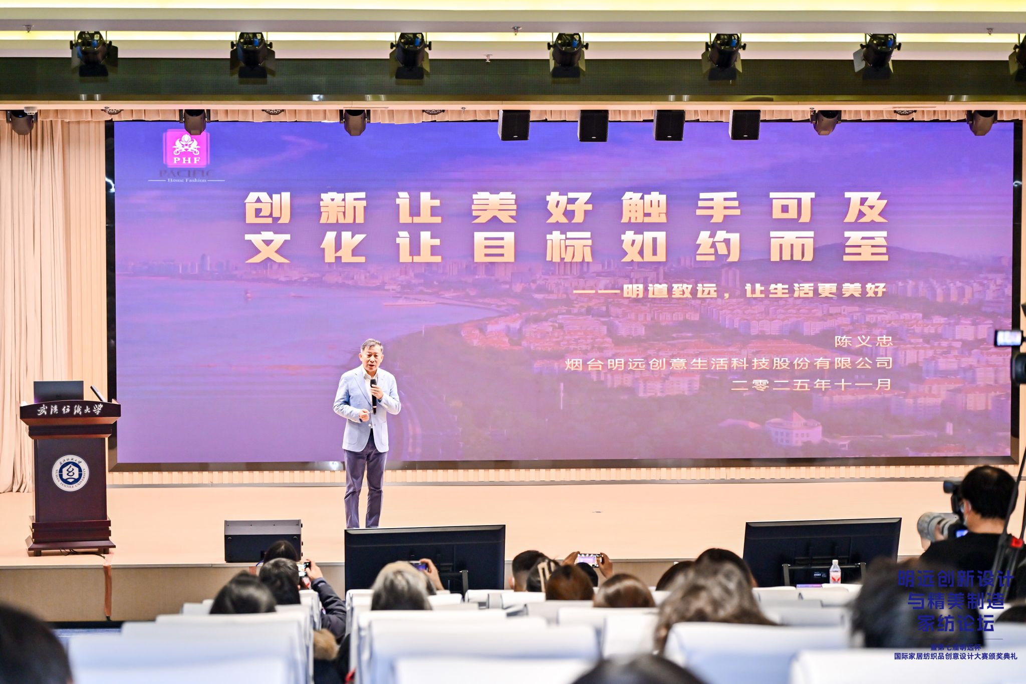 “明远杯”国际家居纺织品创意设计大赛创始人、明远创意生活科技股份有限公司董事长陈义忠进行了主题以“创新让美好触手可及,文化让目标如约而至”的主旨演讲,回顾了公司发展历程,展望了未来前景与目标。谈到“明远杯”他认为,这不仅是一项设计竞赛,更是行业发展的“加速器”和“孵化器”,希望大赛在推动行业创新、促进产教融合、传承文化与技艺、培养行业人才、引领消费趋势方面发挥积极作用,推动中国家纺行业从“制造”向“创造”转型,实现高质量发展。