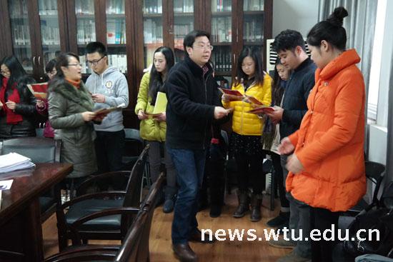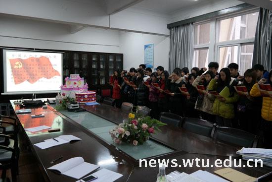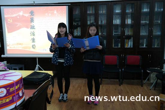 学生党员“政治生日”是指其被支部大会讨论通过为预备党员的周年纪念日。活动伊始,全体党员重温了入党誓词,再一次向党组织庄严宣誓。接着,学生党员代表汇报了自己在预备期里的成长经历和感受;两名学生党员代表表演了诗朗诵《党颂》,回顾了中国共产党成立之初的情景。与会领导和老师为参加本次活动的50余位学生党员赠送了“政治生日”贺卡,并点燃了生日烛光。