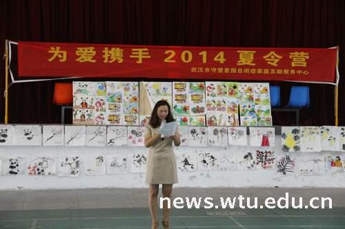 武汉市自闭症亲友会童瑞琴会长首先对我校的大力支持表示衷心的感谢、对四所高校、五个国家的大学生志愿者们15天来的辛勤付出表示赞赏。艺术学院分党委副书记苗淑贤高度评价了志愿者们的大爱无私的精神,并希望这样的活动能够长期坚持下去。自闭症儿童、家长代表分别发言,阐述了孩子们的成长和感动。