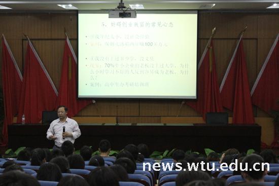 讲座开始后,田博士高呼“这是一个谈论财富的年代!这是一个梦想财富的年代!这是一个梦想财富的年代!”他幽默的与同学互动,让同学们和大家一起念“朋友,放飞你的理想,张开你的双臂,让我们拥抱财富吧!”。并给大家引出第一个问题“你想当老板成为富人吗?”,他认为真正可怕的不是肢体残疾,最可怕的是精神残疾。所以,他提出“要先富裕脑袋,再富裕口袋”。希望大家能成为对社会有用的人。