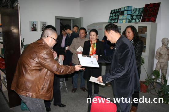教师作品展。随后参观了南湖校区艺术三院教师工作室,在参观完我院公共艺术教师工作室后,黄冈横天文化城筹备组组长邓中原对公共艺术表示了浓厚兴趣:“我们在黄冈市投资了两百个亿打造黄冈文化名人城,公共艺术设计对于我们这次名人城雕塑项目至关重要,希望通过这次活动,能与贵校进行项目合作”。