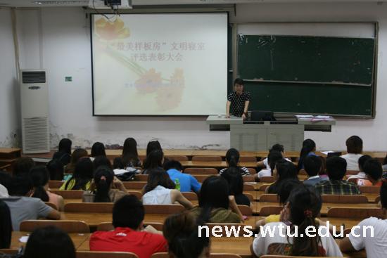 会议伊始,艺术学院学生会后勤部负责人以PPT展示向大家介绍了本学期我院学生寝室安全、卫生情况,并对他们的工作作了交流和总结,随后范书记和辅导员们为获奖文明寝室颁发了奖状和奖品。