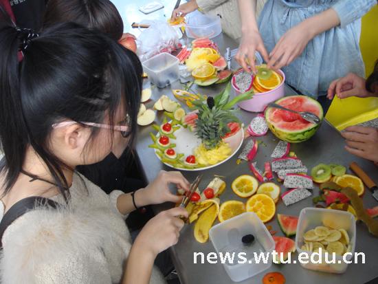 当天下午3点,活动在南湖校区学生食堂拉开帷幕。本次比赛共有14个以班级为代表参赛,每组6人。各参赛同学积极开动脑筋,不断创新,在比赛过程中互相帮助,有的切水果,有的摆造型,经过一轮紧张的制作,苹果、香蕉、草莓、橘子、黄瓜等各式水果、蔬菜,在同学们精细的刀工下,被改造成片、丁、丝、块等各种形状,拼放成各种图案,作品色彩艳丽,奇思妙想,精美绝伦。有的作品命名为“花开妇贵”,祈福母亲身体健康;有的作品命名为“同舟共济”,寓意纺大学子与母校同进步、共发展。作品充分展示了参赛学生的创新能力、动手能力以及感恩母亲、感恩母校的真挚感情。