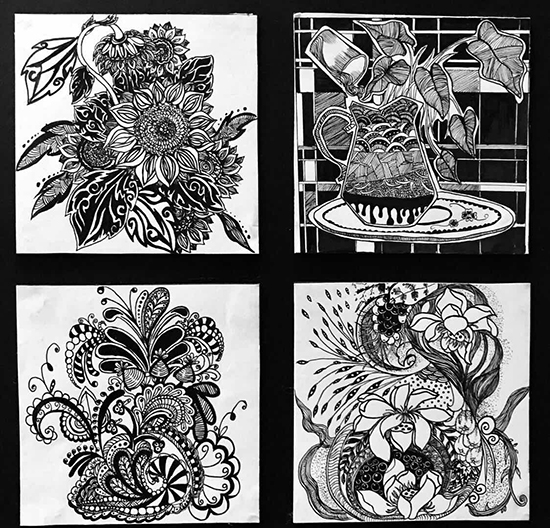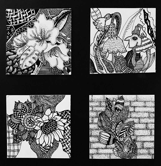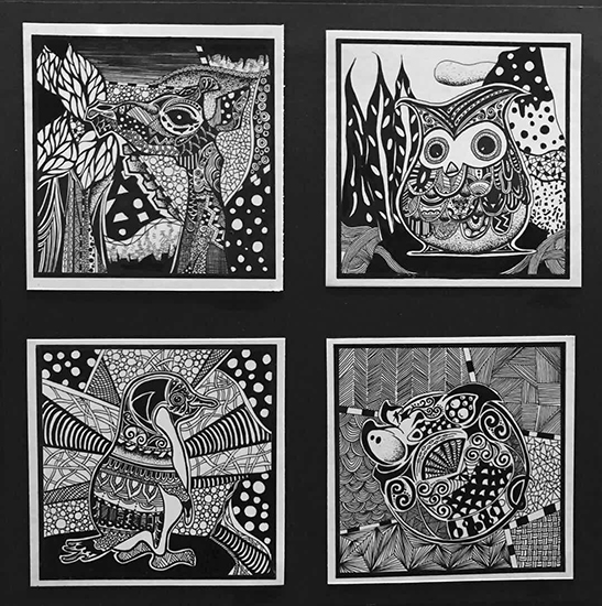 在课程学习的过程中,环艺11602班的同学们灵活运用点、线、面等多种形式的表现方式,使画面黑、白、灰变化丰富,虚实层次错落有致,疏密空白安排得体,黑白关系鲜明。在形象上进行夸张、取舍、变形,并竭力使画面富有情趣,有节奏,有韵律,视觉效果强烈,具有较强的装饰性。