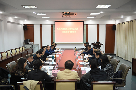10月23日下午,武昌区委书记刘洁率区委常委、宣传部长李蓉,区委常委、区委办主任周明,区政府副区长向悦及区委办副主任、区政府办副主任等一行15人来我校考察调研。校长彭育园,党委副书记、纪委书记刘功成和副校长姜明华接待了武昌区领导的来访,双方就校地合作武昌区胭脂山一坊规划改造项目在南湖校区数字化中心座谈,宣传部、科技处、百合漫画
