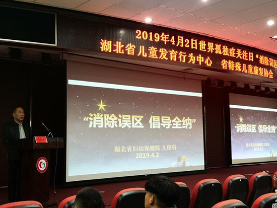 为迎接世界第12个自闭症日的到来,4月2日上午在省妇幼4号楼学术报告厅,蓝灯志愿团携手湖北省妇幼保健院开展了“消除误区 倡导全纳”世界孤独症日科普活动。妇幼保健院党委委员闫炯、省残联彭颐处长、省卫健委妇幼处王劲松处长、我校艺术学院党委陈良栋书记以及一百多名自闭症患儿家长参加了活动。