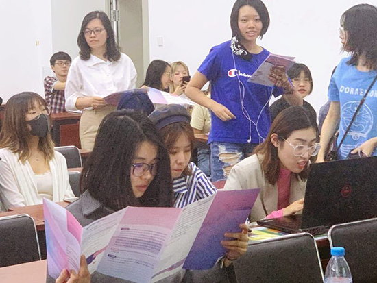 在高校宣讲会中,宣讲老师从设计大赛背景、大赛主题、参赛内容和作品案例分析四个方面根据不同专业对学生进行了参赛指导。在宣讲中,宣讲老师还结合作品案例,详细的描述了家纺作品是如何孕育而生,包括围绕比赛主题、开拓设计思维、设计作品对比和实物构图等。宣讲结束后,宣讲老师和学生们进行了交流互动。