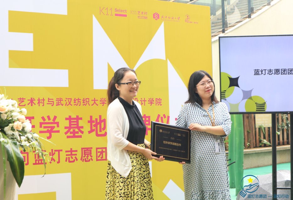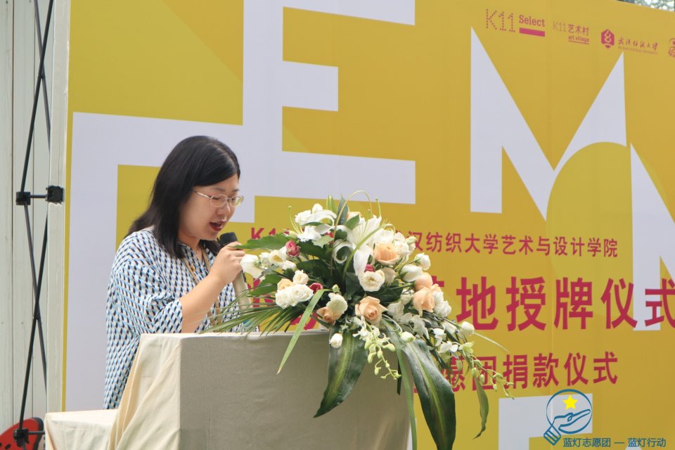 校外研学基地授牌仪式暨向蓝灯志愿团捐款仪式在K11购物艺术中心蝴蝶公园举行。光谷K11艺术村的总经理章后仪、百合漫画