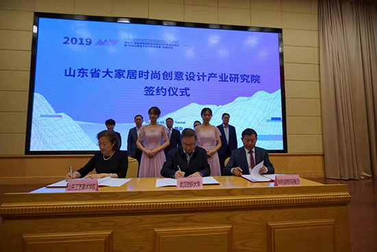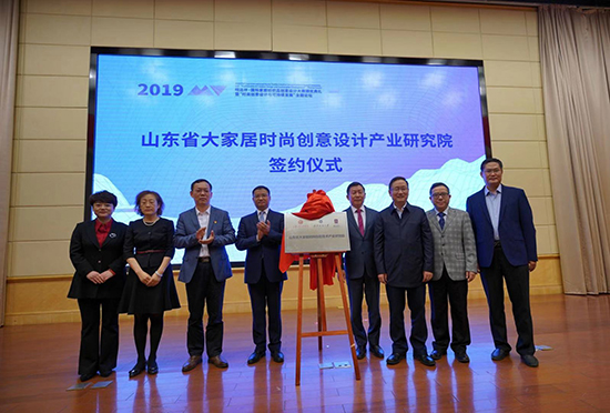 “山东省大家居时尚创意设计产业研究院”签约仪式由中国纺织品进出口商会会长曹甲昌、山东省民营企业高质量发展烟台服务二队队长李宸先、福山区副区长王军伟、福山区工信局局长林丽云共同见证,由彭育园校长、山东工艺美术学院副院长李新、烟台明远家用纺织品有限公司董事长陈义忠共同签署协议。协议签署后,由三方负责人共同为“山东省大家居时尚创意设计产业研究院”揭牌,“山东省大家居时尚创意设计产业研究院”正式落地建成。