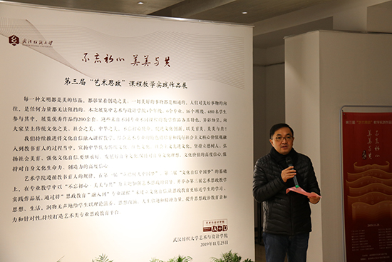 从研究生到本科生4个年级、6个专业、16个班级、480余名学生参与其中,贯穿整个学期。展览优秀作品约200余套/件。据曹刚副院长介绍,学院遵循教书育人的规律,在第一届“立德树人中国梦”、第二届“文化自信中国梦”的基础上,学院在专业教学中以“不忘初心·美美与共”为主题加强艺术思政的引导,并举办第三届艺术思政教学实践作品展,持续通过将“思政教育”融入到“专业课程”来建立文化自信,让思政教育更贴近学生的学习、思想、生活,润物无声地给学生以理论滋养、思想内涵、人生启迪和精神力量,提升思想政治教育亲和力和针对性,持续打造艺术类专业思政教育平台。