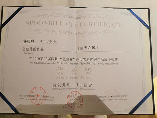 公共艺术11602班学生郭唐威的设计作品(虚无之境)荣获优秀奖。
