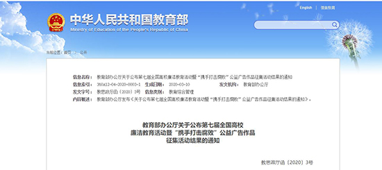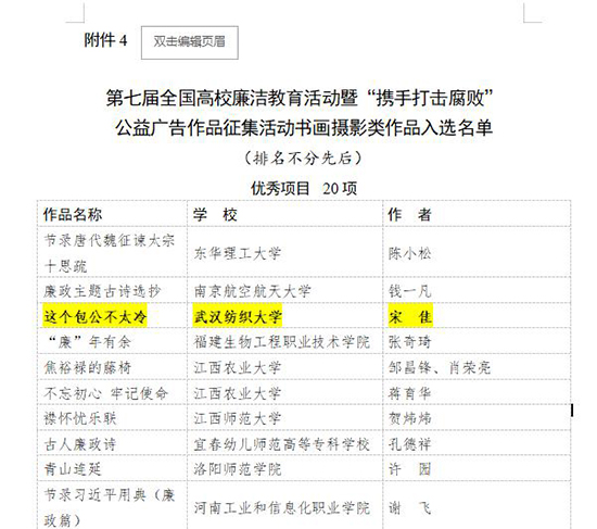 据悉此次活动旨在深入学习贯彻习近平新时代中国特色社会主义思想和党的十九大精神,认真贯彻落实习近平总书记关于教育的重要论述,巩固深化“不忘初心、牢记使命”主题教育,教育部以“守初心、知敬畏、扬正气、担使命”为主题,进一步推进高校师生廉洁教育和校园廉政文化建设。大赛分为艺术设计类、网络新媒体类、表演艺术类、书画摄影类4大类。由学校征集、把关,省级遴选、推荐,最终经教育部思想政治工作司组织专家对各类作品从政治性、思想性、艺术性、教育性等方面进行评定,每类确定精品作品10项、优秀作品20项、入围作品30项,在全国高校展示推广。