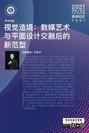 现为湖北美术学院教授的 2001届叶佑天,在讲座中结合自己设计创作历程,作了一场题为《视觉造境:数媒艺术与平面设计交融后的新范型》的讲座,幽默风趣地分享自身创作案例的同时,也让学生明白了在当今快速发展的时代下,设计跨专业意识的重要性。并强调要喜欢设计、热爱设计。要注重思考、方法及生活感悟的提炼,倡导培养创新性思维。
