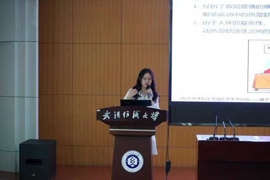 服装学院服装设计与工程张雅婷同学作题为《上衣宽松量与运动热湿舒适性的关系研究》的主题报告;