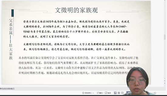 在讲授的过程中,杜老师还组织了讨论环节,同学们与老师积极互动,就社会学视角的艺术史研究问题进行了深入的讨论。我院研究生积极参与了讨论与分享,如:冯佳慧同学对社会学研究方法在艺术史中运用的利弊进行了思考;高琪云同学谈到大多文徵明的文献大多将他看作独立的个体,并未探究他在不同场域下为自己建构的身份特性。