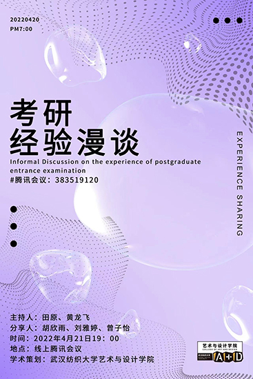 考研经验漫谈交流会在腾讯会议举行。本次交流会共邀请到3位2018级成功考上研究生的学生曾子依,刘雅婷,胡欣雨。通过线上的方式,从备考方法、作息时间、面试技巧、心态调整等各方面分享了自己的考研感悟。视觉传达系主任黄龙飞,教师田原以及各年级有意向考研的同学四十余人参与了本次活动。