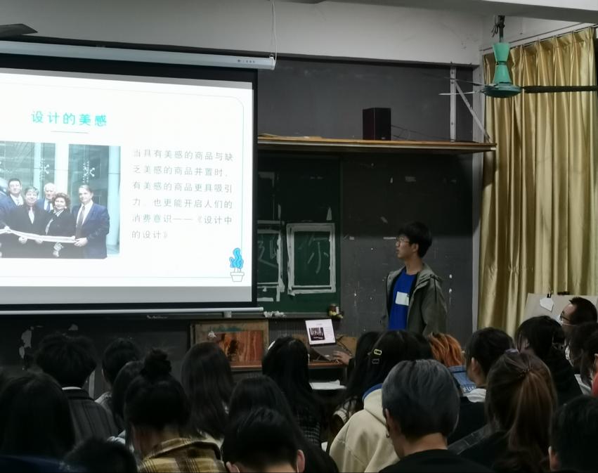 黄磊同学阐述了关于设计的美感,设计的背景,人们对于设计的看法以及设计师的目的,并生动的展示了设计的实例图,让在座的同学都对设计研究产生了浓厚的兴趣。