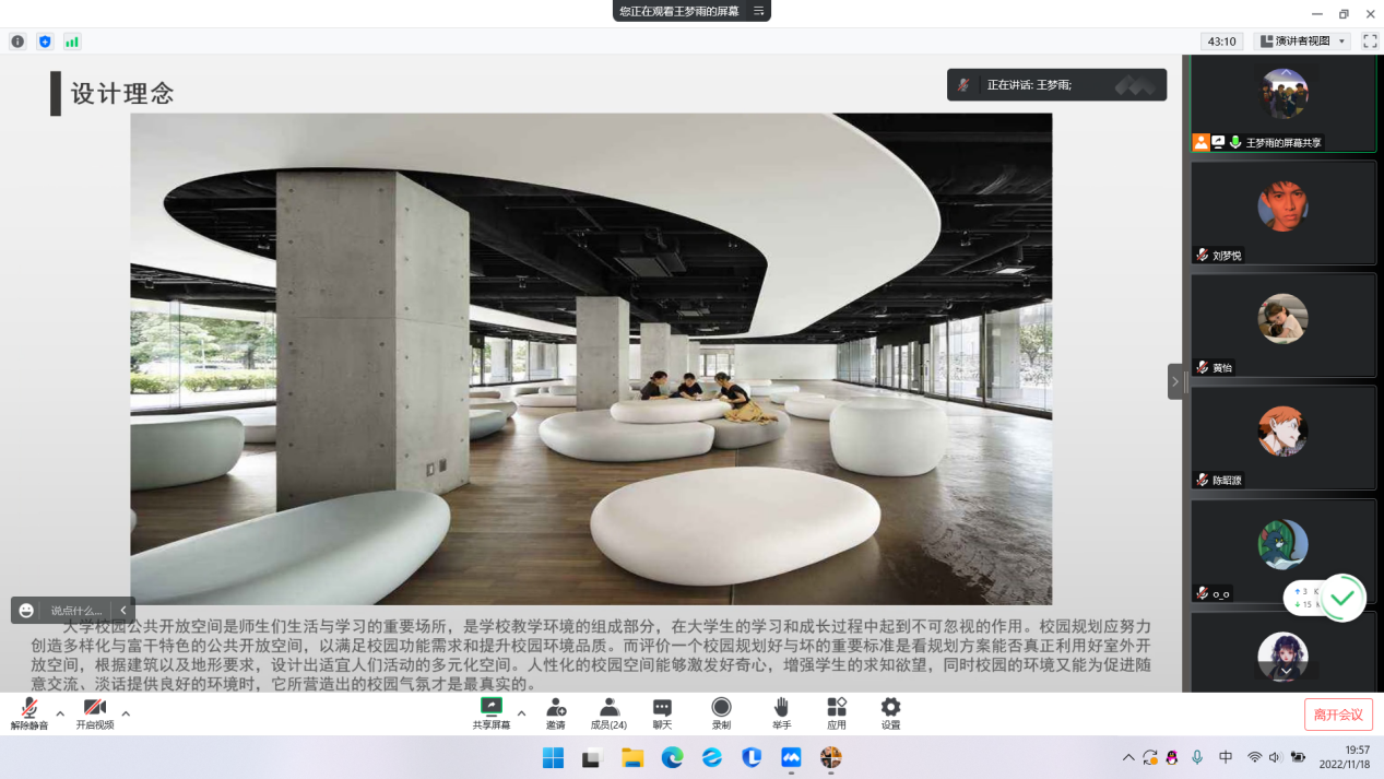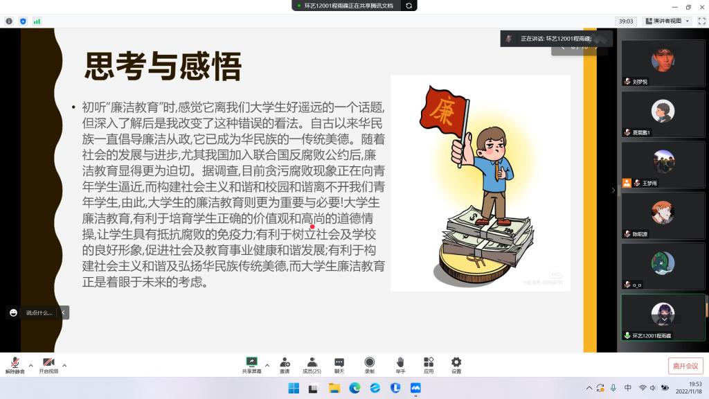 为加强学校廉政文化建设,弘扬崇廉尚洁的良好风尚,我院决定举办面向全校的第十二届“我爱阳光” 廉洁教育 艺术设计与绘画作品大赛暨第六届艺术思政作品展。本次大赛围绕“喜迎二十大,笔墨扬正气,丹青送清风”的主题展开。同学们积极踊跃的参与了大赛,部分同学获得了较好的名次。11月18日晚上,艺术学院环境设计系组织该系三年级学生在线上进行了第十二届廉政书画大赛作品创作交流本科生论坛活动,主讲人为环境设计系夏展鹏、刘梦悦、勾婷婷、韩文慧、黄怡、程雨蝶、王梦雨、肖媛媛八位同学。