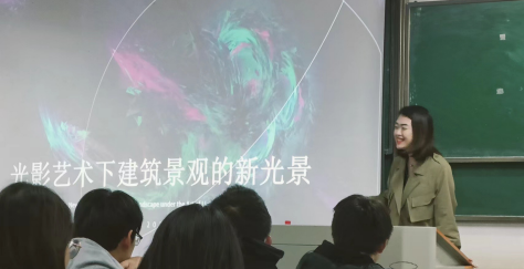 论坛上,周梦烨主要讲述了光影与自然景观,建筑与光影的融合新趋势,光影与建筑(闲置空间)的结合、光影与互动装置建筑、光影与沉浸式建筑等设计学知识,并通过影像资料为同学们展示了五彩斑斓、光怪陆离的建筑光影新景观。她指出,当光影新媒体技术被逐步开发并走进人们的生活,传统观念中的视觉艺术已不再是单一的设计模式,在大数据和先进分析和计算方法时代,将建筑理解为一个有生命的有机体,需要更细致地研究人体的结构不断变化的意义之间的复杂关系,与僵化的建筑形式相比,生物似乎拥有并控制着极其丰富的动态的建筑曲目,这使得它们更容易受到无休止的排列和随机性,同时受到方向迷失和熵的影响,以支持光影艺术的不断变化其功能需求。