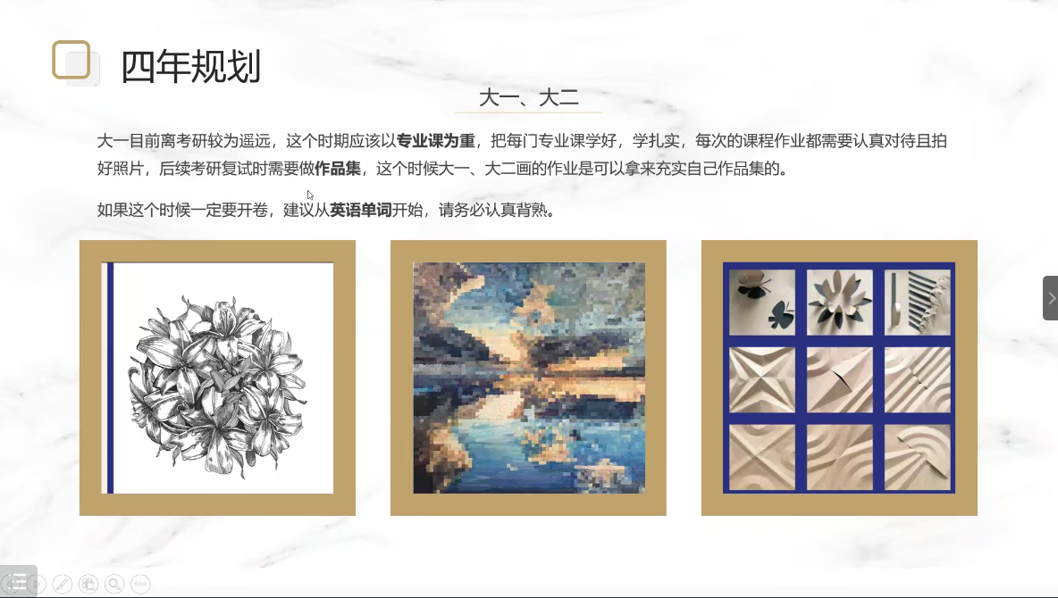 活动开始袁梦介绍自己的考研情况,并通过2000-2022年的考研形势讲述考研竞争激烈的程度,以此建议想要考研的同学们早准备,然后又介绍了专硕考研的优势,以及如何正确的择校择专业。其次,袁梦又讲述了她在大学本科的前两年积极参加各类设计比赛,以及利用课余时间考取各类证书等学习规划,为大三能够心无旁骛的进行研究生复习打下基础,告诉同学们做好规划的重要性。