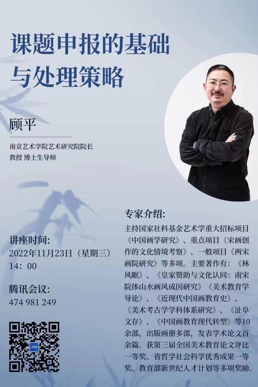 专家介绍:顾平教授主持了国家社科基金艺术学中大招标项目《中国画学研究》、重点项目《宋画创作的文化情景考察》、一般项目《两宋画院研究》等多项。主要著作有:《林风眠》、《皇家赞助与文化认同:南宋院体山水画成因研究》《美术教育学导论》、《近现代中国画教育史》、《美术考古学学科体系研究》、《沚阜问存》、《中国画教育现代转型》等10余部,出版画册多部,发表学术论文100余篇。获第三届全国美术教育论文评比一等奖,省哲学社会科学优秀成果奖一等奖、教育部新世纪人才计划等多项奖励。