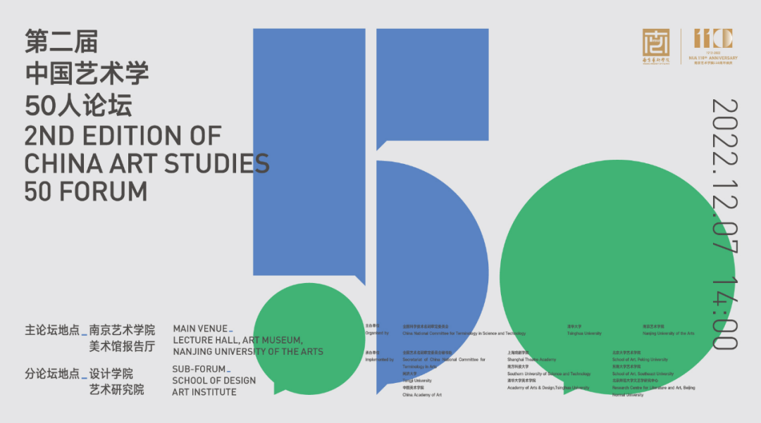 由全国科学技术名词审定委员会(国家名词委)、清华大学、南京艺术学院共同主办,全国艺术名词审定委员会秘书处、同济大学、中国美术学院、上海戏剧学院、南方科技大学、清华大学美术学院、北京大学艺术学院、东南大学艺术学院、北京师范大学文艺学研究中心联合承办的“第二届中国艺术学50人论坛”,于2022年12月7日至8日在南京艺术学院举办。此次论坛是南艺110周年校庆期间最重要的学术活动。