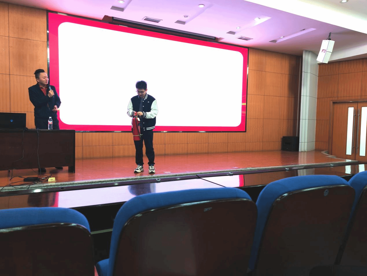 陈斌通过图片、视频展现了惊心动魄的火灾现场,从防火、灭火、逃生和自救四个方面阐述了消防安全的重要性。陈斌分析了常见的失火原因及日常生活中存在的安全隐患,他提醒大家要熟记安全标识,将火灾应急处置措施和疏散逃生技巧熟记于心,并现场演示了灭火器的使用。