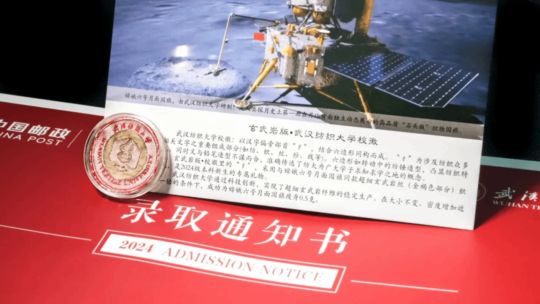 校徽,玄武岩版校徽,采用与嫦娥六号月面国旗,同款超细玄武岩丝(金褐色部分)织成,是送给2024级新生们的专属礼物。