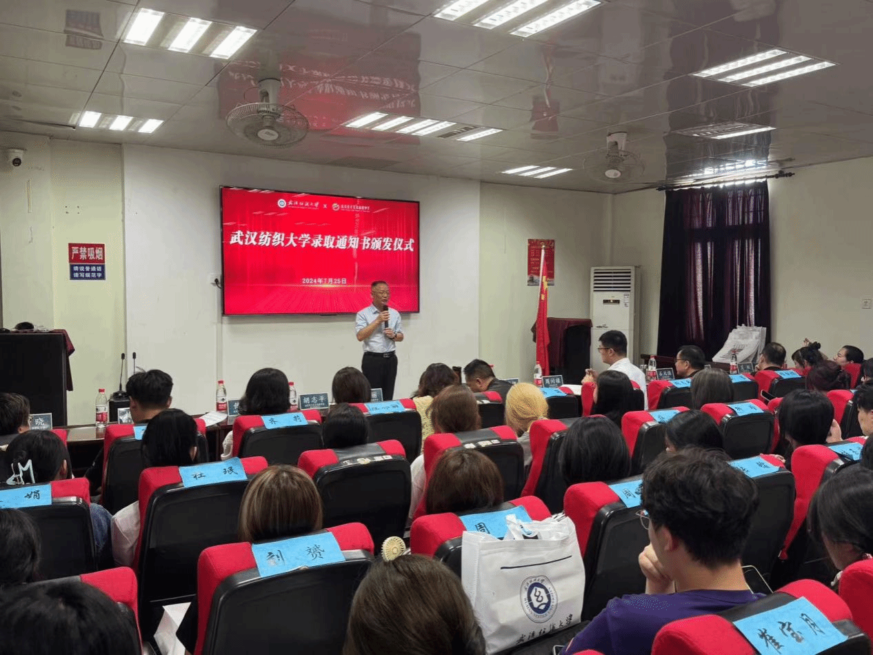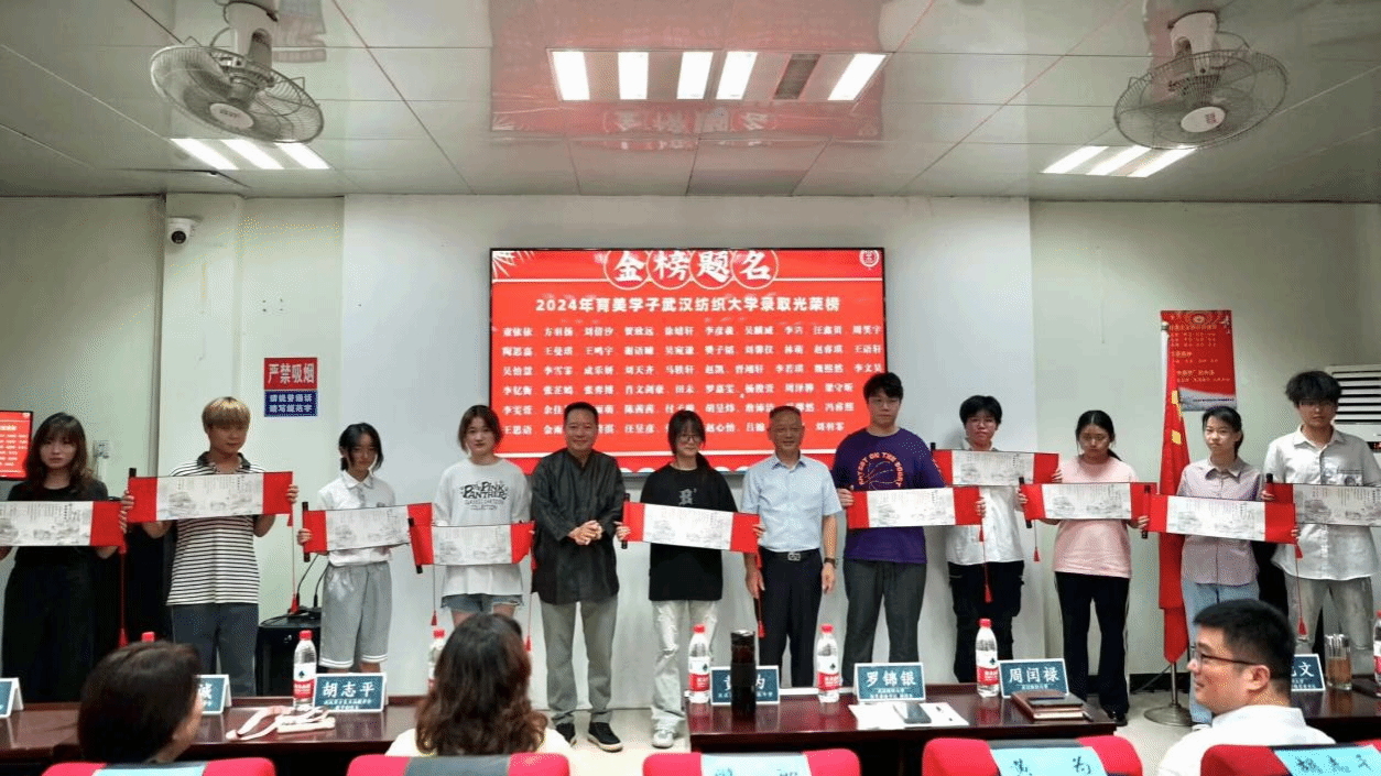 的57名新生一一发放录取通知书和玄武岩版纺大校徽。罗锦银与同学及家长们就关心问题进行了亲切交流,详细介绍了纺大2024版录取通知书设计理念。