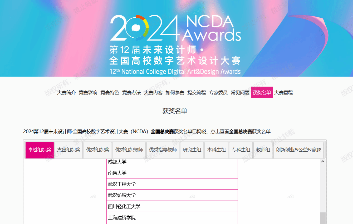 未来设计师·全国高校数字艺术设计大赛(NCDA)是入选《全国普通高校学科竞赛排行榜》,多家教育厅认定,“学习强国”学习平台支持,对接联合国国际赛的国家级大学生竞赛。每年有1800多所高校参赛,近93%的985、一流大学和近95%的知名设计院校参赛。大赛秉承“设计为人民服务,培养未来设计师”的理念,坚持艺术与技术并重、学术与公益并重,倡导可持续发展,绿色低碳设计,传承红色文化,助力乡村振兴;鼓励大学生积极参与创新设计,用专业知识服务社会、拓展国际视野、培养团队协作精神,成为未来的主力设计师,得到“学习强国”学习平台等权威媒体的宣传报道及联合国机构的称赞。