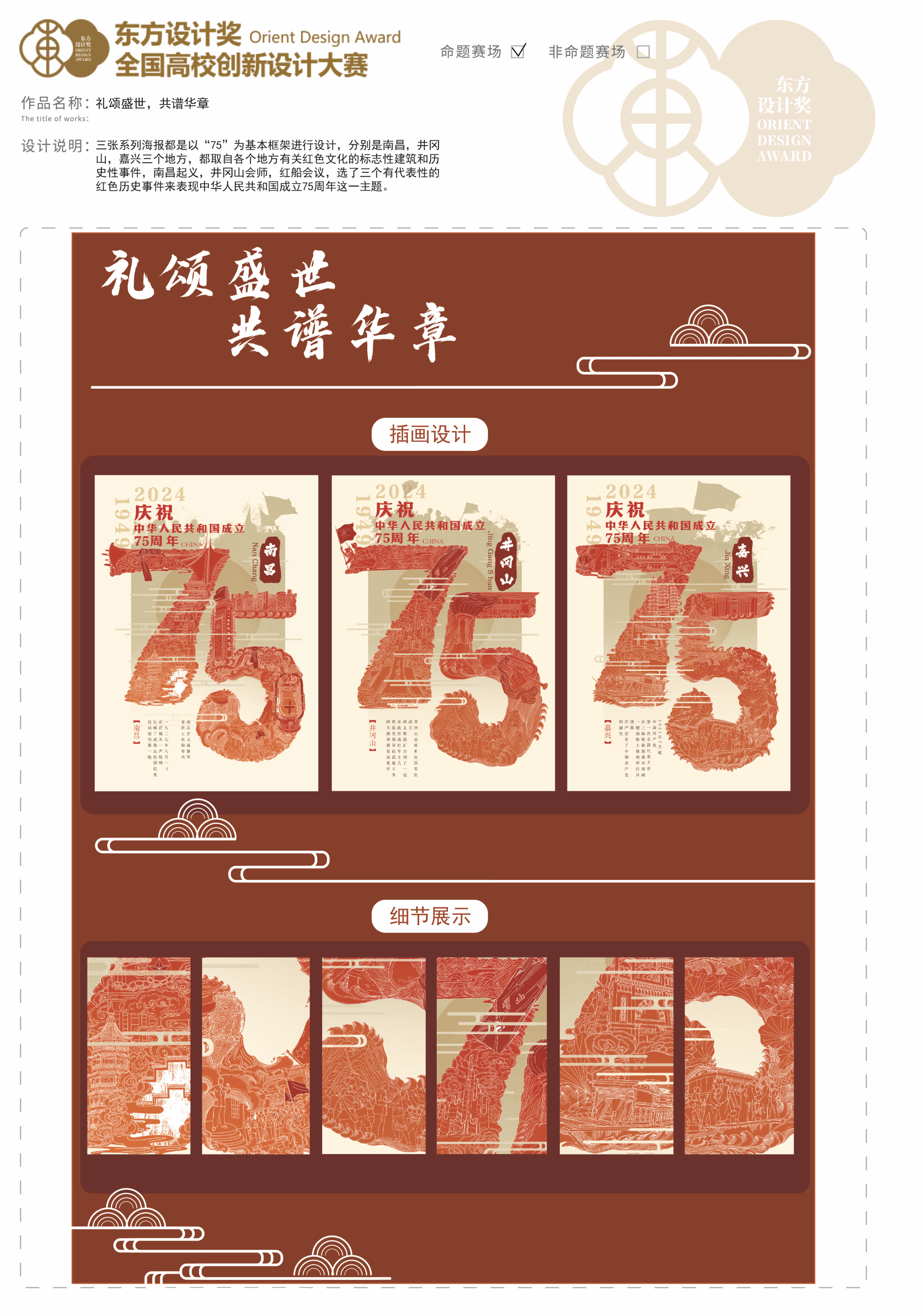 文化需要营造,创意需要凝练,美需要发掘。在中华人民共和国成立75周年之际,学校举办东方设计奖“红色之光”2024红色文化创意大赛获奖作品展暨第八届高校“艺术思政”作品展,为祖国的七十五周年华诞送上最美的祝福!