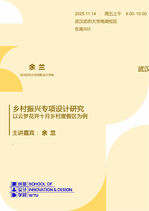 在南湖校区艺设楼东南303教室开展“乡村振兴专项设计研究——以云梦花开十月乡村度假区为例”本科生专题讲座。本次讲座由学院教师余兰主讲,设计类本科生参与学习。