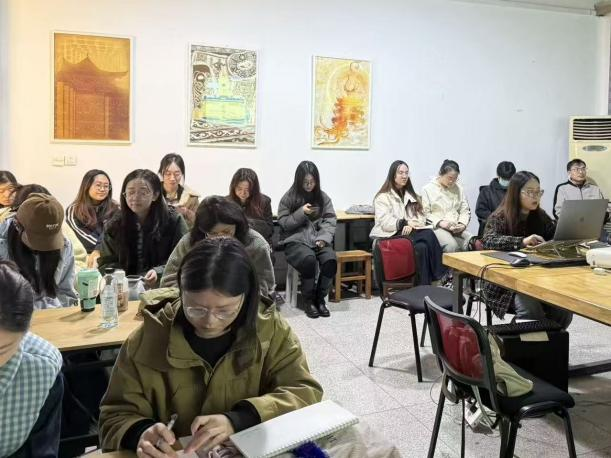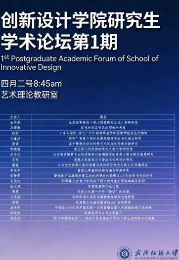 论坛中,研究生们围绕生态美育视角下美术馆展陈交互设计策略展开创新探索,同时对汉代丝织品云凤纹、楚艺术凤鸟纹、楚玉器几何纹饰、曾侯乙尊盘纹样等传统纹样进行深度图像学考察。针对传统工艺的当代发展,聚焦于清代广州外销通草画纺织图像、周村丝绸染织技艺、恩施土家族西兰卡普、荆楚纺艺等内容,探讨其传承创新与当代转化路径;在跨文化传播研究领域,同学们则聚焦 6-9 世纪丝绸之路织物翼马纹、云冈县曜五窟飞天图像等文化遗产,分析其时空演变与跨文化传播规律。
