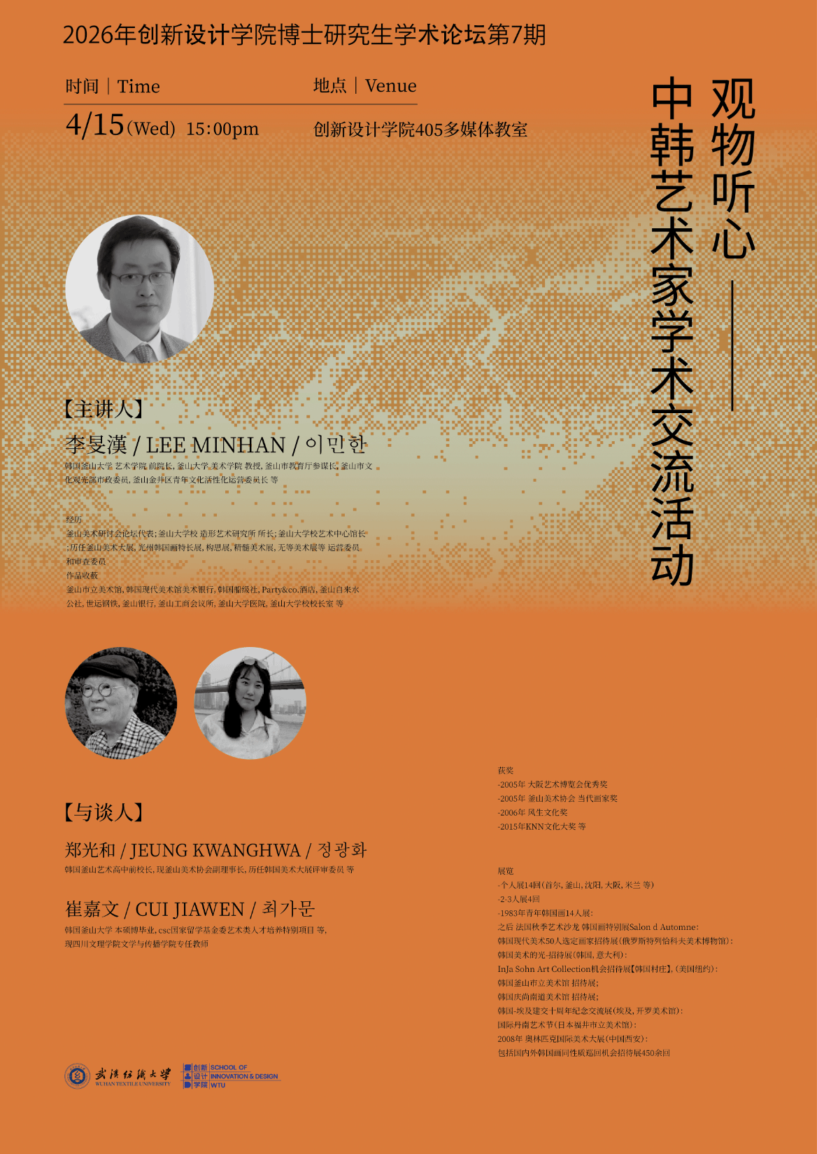 主办,特邀韩国釜山大学美术学院前院长李旻漢教授、釜山美术协会副理事长郑光和先生、四川文理学院崔嘉文老师莅临交流,聚焦博士研究生学术成长、科研创新与学科发展核心需求,搭建中韩博士培养与学术互鉴的优质平台。