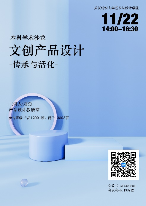 非物质文化遗产的传承与活化一直是国内高校产品与视传专业的重要培养方向,为了更好的让学生了解我国传统文化的背景和内涵,2022年11月22日产品教研室刘勇老师举办了一场以“文创产品设计-传承与活化”为主题的本科学术沙龙,以线上会议的形式进行,产品12001班与视传12003班参与了此次会议。