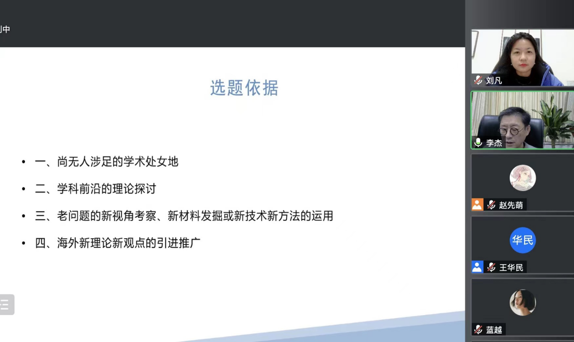 随后,李杰教授从选题依据、立论依据、研究述评、选题意义、研究框架、重点与难点、主要目标、基本思路和重要观点、创新程度、预期意义和价值等多个方面进行了详细的讲解。首先选题依据可以是以下几个方面:一、尚无人涉足的学术处女地;二、学科前沿的理论探讨;三、老问题的新视角考察、新材料发掘或新技术新方法的运用;四、海外新理论新观点的引进推广。其次,李教授指出,立论依据要有宏观视野和全局观点,充分阐述为什么要申报这个项目,要充分了解该研究领域的研究状况、取得的进展、发展趋势,并对前人未涉足、属于填补空白的新研究项目,其价值和意义要重点加以揭示。
