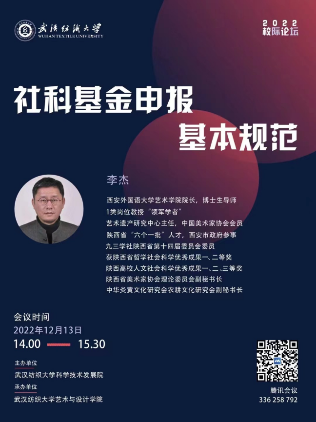 专家介绍:李杰:九三学社社员,美术学博士,教授,博士生导师,西外学者1类岗位“领军学者”。西安外国语大学艺术学院院长、艺术研究所所长,艺术学学科带头人、艺术学理论学术带头人。陕西省“六个一批”人才,中国美术家协会会员,国家社科基金评审、国家艺术基金评审、教育部人文社科项目评审、陕西省社科基金评审、西安市社科基金评审等,陕西省省级人才项目评审专家,陕西省艺术类高考专家组专家,陕西省文化和旅游厅入库专家,陕西省美术博物馆学术委员,陕西唐代艺术研究会副会长,中华炎黄文化研究会农耕文化研究会副秘书长,汤用彤国学院特聘教授,中国古迹遗址保护协会会员。
