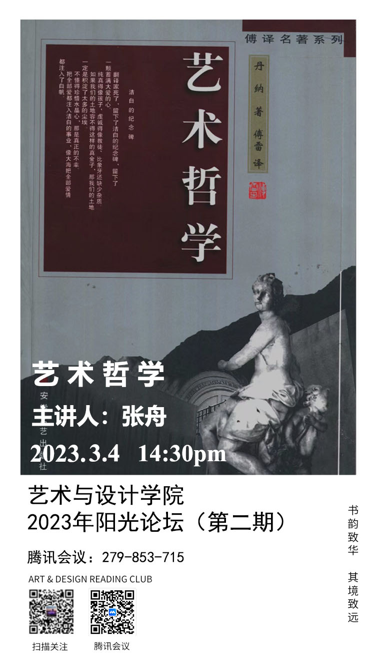 会议开始,张舟老师介绍了本次论坛的交流主题并简述本次论坛进程以及举办目的。随后,他以《艺术哲学》为题,介绍了丹纳在书中提出的“三要素”的重要性以及如何理解并将其运用到我们的艺术学习中。除此之外,张老师还通过各国艺术的实例辅助理解本书中的观点,探讨了种族、环境、时代对艺术审美的影响。