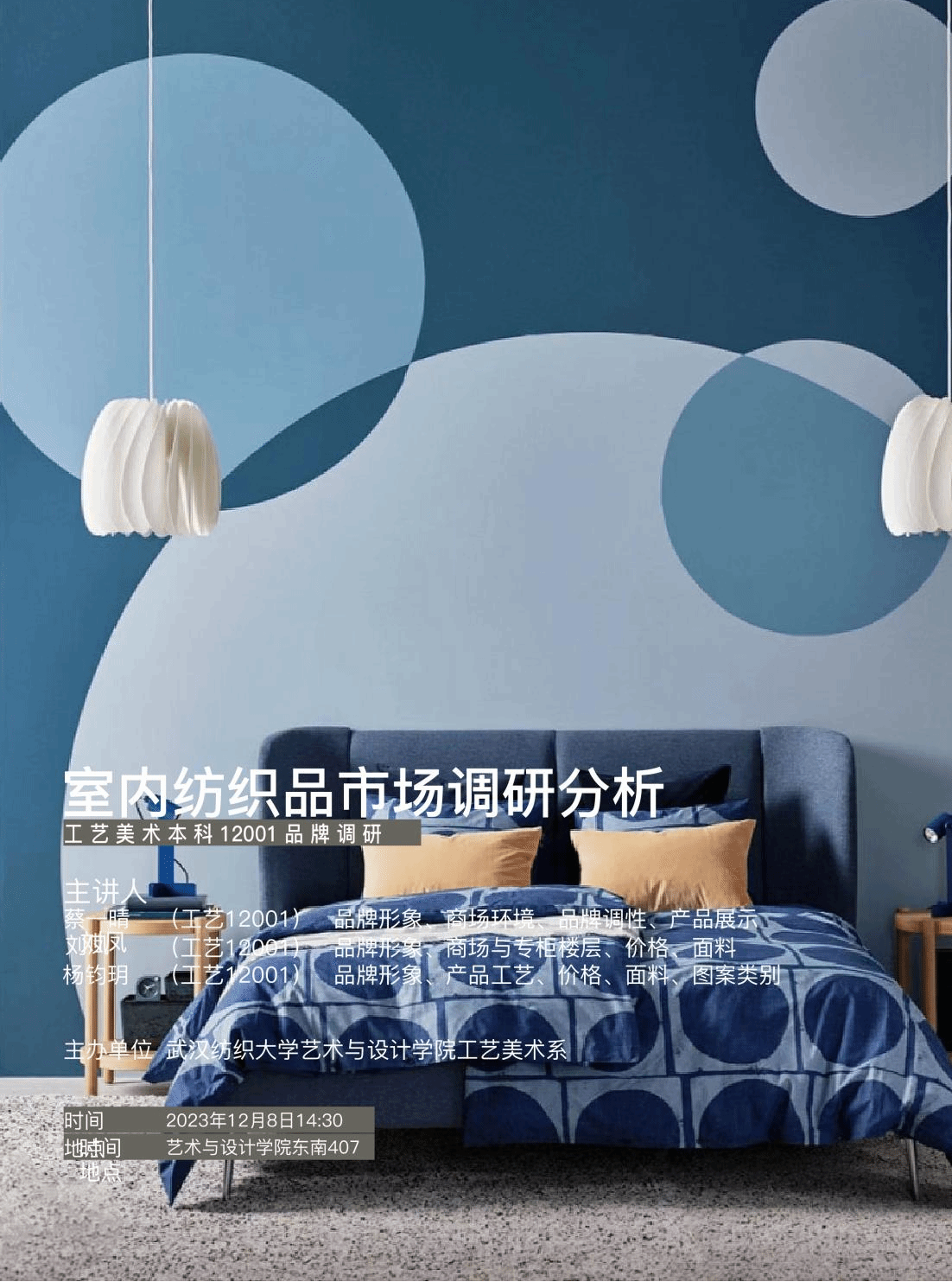 本次论坛是根据工艺美术专业调研的内容来进行展开的,以室内纺织品品牌为主,分别调研了富安娜、宜家、拉米洛、等品牌。调研内容包括品牌形象、产品工艺、商场环境、品牌调性、产品展示、商场与专柜楼层、价格、面料、色彩 、图案类别、市场需求、竞争格局、行业格局、消费者行为、行业趋势、营销策略等。