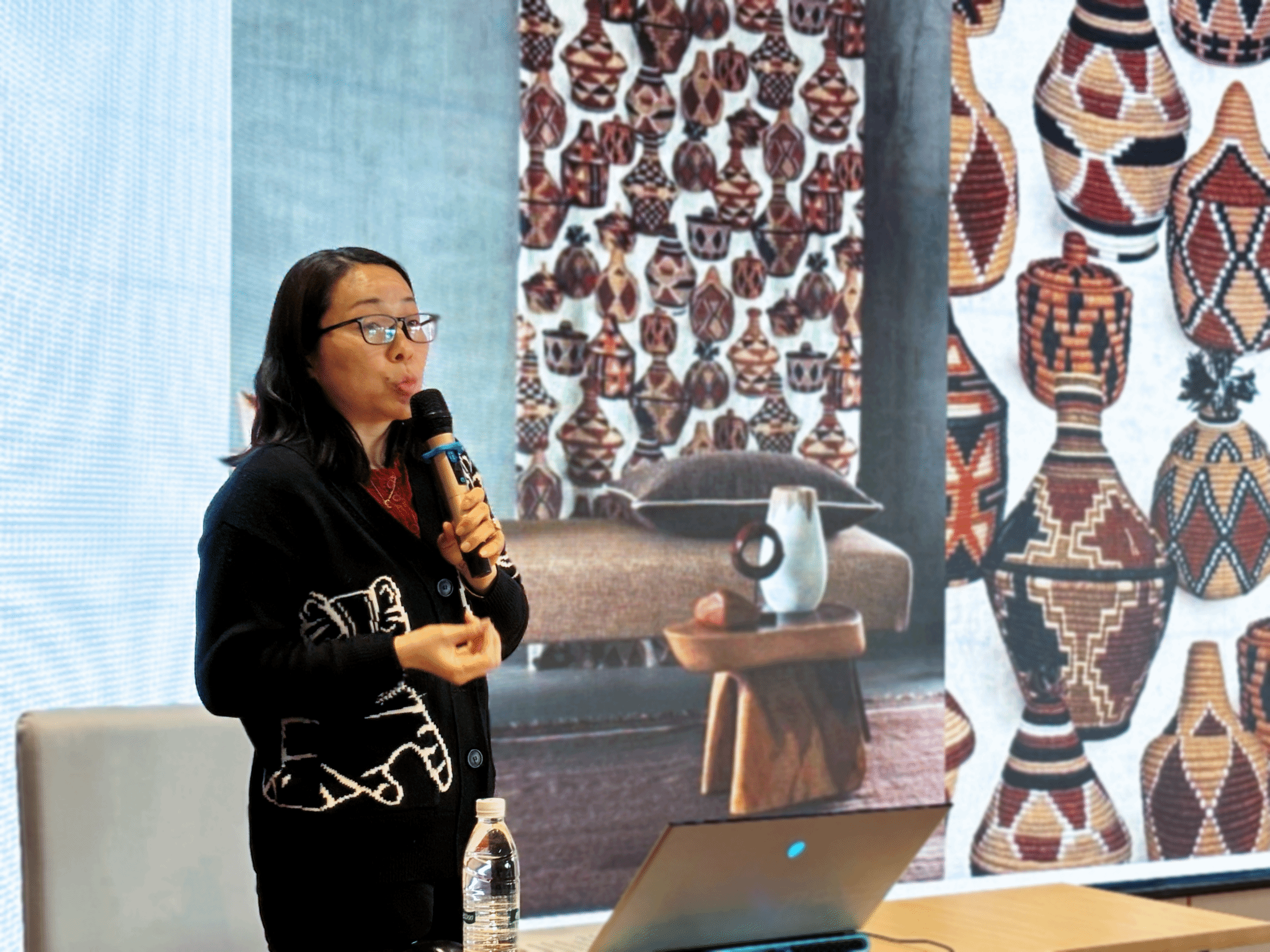 李明娟围绕《装饰语言的形式表达》为学生们构建起系统的装饰语法体系。从青花钴料发色的窑变规律,到现代构成中的节奏公式,演示了如何将传统纹样转化为可量化的装饰模块。