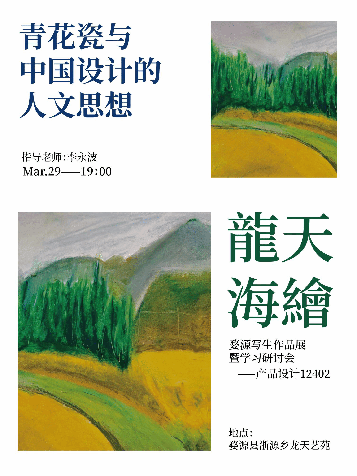 李永波老师认为婺源徽派建筑的人文理念与山川自然的亲和关系,景德镇世界标签的青花瓷精华,尤其在这个信息时代极为重要。同学们这段时间暂时远离喧嚣的城市,走进自然写生,望着山川的烟云,闻着青草的清馨,花的芳香与娇艳,溪流与山谷间鸟的悦音,如清泉流淌在每个人的心间。艺术设计在这里生发,来于自然,回归内心的升华。让我们反思艺术在当下这个信息时代,应如何回望传统,关注当下,延展未来。艺术设计是关于内心存在的展现。